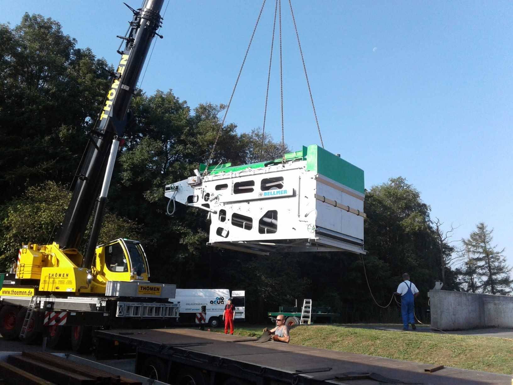 Nach der Inbetriebnahme einer mobilen Schlammentwässerung erfolgte die Demontage und Entsorgung der alten Anlagenkomponenten. Die Maschinenhalle wurde dann für die Aufstellung der neuen Anlagenteile vorbereitet. Als Schlammentwässerungsaggregat kommt eine Bellmer Winkelpresse zum Einsatz, die den Klärschlamm auf einen Trockensubstanzgehalt von größer 23% TS entwässert. Im nachfolgenden Doppelwellenpaddelmischer erfolgt durch Zugabe von Kalk eine Konditionierung des Schlammes, bevor er über Spiralförderer in Container verladen wird.