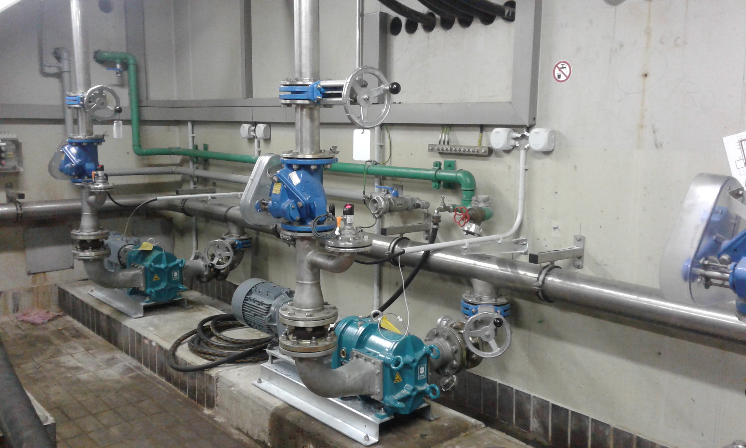 Die Beschickung der neuen Eindickaggregate erfolgt über drei neue Drehkolbenpumpen, welche im Kellergeschoss aufgestellt sind. Die drei vorhandenen Drehkolbenpumpen wurden hierzu demontiert.