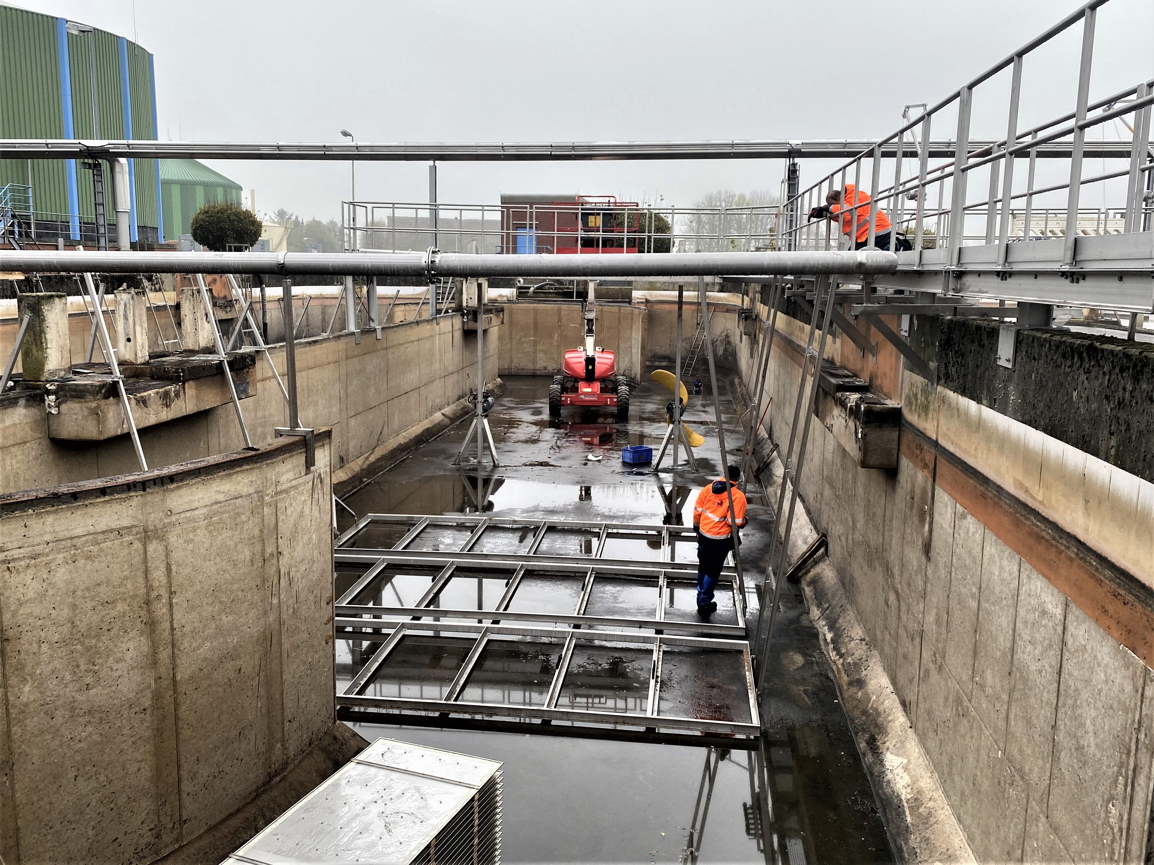 Die nötige Durchmischung der Umlaufbecken wird durch die Installation neuer langsamlaufender Tauchmotorrührwerke gewährleistet, die ebenfalls mit Frequenzumrichter zur effizienten Drehzahlregelung ausgestattet sind.